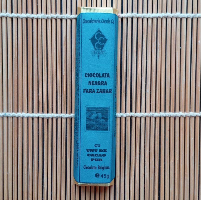 Ciocolata neagra fara zahar adaugat 45g. Contine zahar prezent in mod natural. Consumul excesiv poate avea efecte laxative.